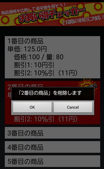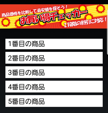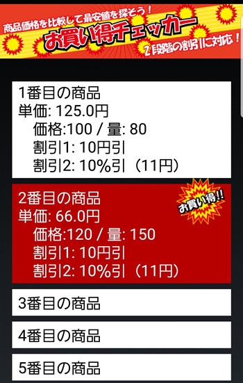 商品情報を1つ以上入力すると、その時点で最安値の商品を目立つように赤色にして、「お買い得」マークを表示します。